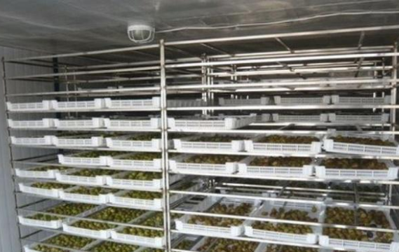 無花果整顆烘干,需要的時間較長一些,先將無花果均勻碼在物料車內,推入烘干房干燥25-30小時后,再推出烘房外陰涼的地方放置一天,再推入烘房內進行二次的烘干。無花果烘干機一天的烘干量視機型規格決定,少的以600-800 斤一個批次,多的2000斤一個批次,10000斤甚至更大產能則考慮對吹及組合方式即可。無花果干燥冷卻后還要有一個回軟的過程,注意用塑料薄膜保護好,以防細菌滋生。經過2天左右的回軟過程即可封袋包裝入庫了。